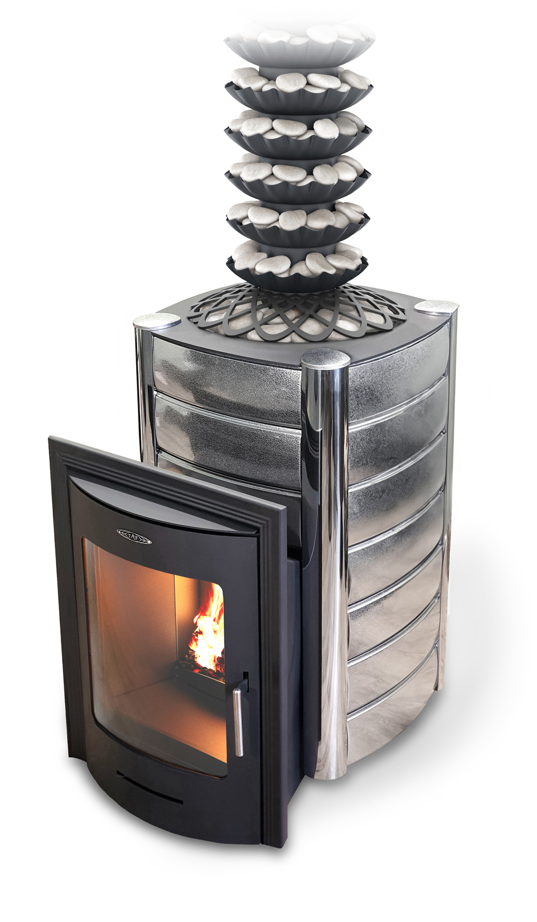 Полукруглое стекло дверцы, ажурный купол, необычный вид печи, натрубная каменка – это совершенно новые и выразительные элементы дизайна банных печей.